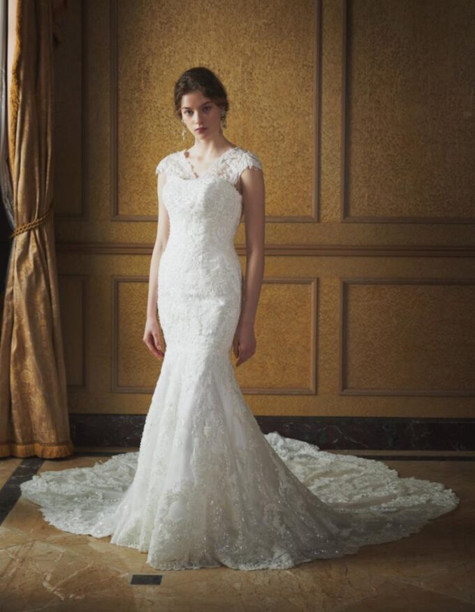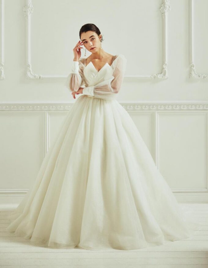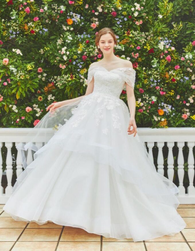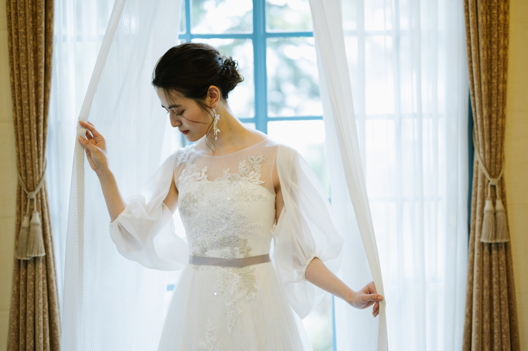 Topics&News トピックス&ニュース Photo Wedding Momona.Yokohama,Kawasaki,Kamakura HOME > トピックス&ニュース > “大人かわいい”を目指す花嫁のためのウェディングドレスの選び方 2024.01.12 update 2025.12.07 Topics #ウェディングドレス選び・レンタル#ドレスで洋装フォトウェディング “大人かわいい”を目指す花嫁のためのウェディングドレスの選び方 ウェディングドレスには、花嫁さまを「可愛く」見せる力があります。 ただ、20代後半〜30代の花嫁さまが求める“可愛い”は、単に甘さを前面に出したデザインではありません。可愛さの中に上品さがあり、落ち着いた雰囲気の中に柔らかさがあるような、そんな“大人かわいい”バランスが今、多くの花嫁さまに選ばれています。 可愛さは年齢とともに似合う形が変わっていきます。 たとえば、若い頃はボリュームたっぷりのプリンセスラインがしっくりくる人でも、結婚のタイミングになると「可愛いけれど大人らしさもほしい」と感じることが増えます。大人になった花嫁さまが選ぶ“可愛さ”には、甘さの中に気品があり、華やかさの中に軽やかさがあります。 この記事では、大人かわいい印象を叶えるウェディングドレス・カラードレスの選び方を、シルエット・色・素材・似合わせ・ロケーションなど多方面から丁寧に解説していきます。 目次大人可愛い花嫁とは?年齢を重ねて似合う“かわいい”の作り方大人可愛いをつくるシルエット選びプリンセスライン:甘さの中に上品さを持たせる王道シルエットAライン:上品と可愛いのバランスが取りやすい万能シルエットスマートなシルエット × 上質素材:可愛いではなく“美しさ”でまとめる大人の選択人気ブランドで叶える“大人かわいい”スタイルナイームカーンのウェディングドレスイサムモリタのカラードレスかわいい系カラードレスはどう選ぶべきかピンク系:可愛さを失わず“大人っぽさ”もつくれる万能カラーブルー系:透明感と清潔感で“大人の可憐さ”を演出ラベンダー・パープル系:可愛さと上品さの中間にある“大人の甘さ”人気の“くすみカラー”:甘さを抑えながら可愛いを表現顔立ち・雰囲気別の“大人かわいい”似合わせ可愛い顔立ち(丸顔・童顔)は甘さを引き算して“大人かわいい”に整える大人っぽい顔立ち(卵型・面長・シャープな印象)は柔らかさを足して“可愛い雰囲気”を引き出すナチュラル・中性的な雰囲気はエアリーな素材や軽いシルエットで“柔らかさ”を足す体型別に似合う“大人かわいい”ドレス背が低い花嫁さまはコンパクトな可愛さでバランスよく見せる背が高い花嫁さまは落ち感のある上品シルエットで大人っぽさを活かす華奢な花嫁さまは立体感で可愛さと華やかさをプラスするふくよかな花嫁さまは縦ラインとポイントデザインで“すっきり可愛い”をつくるフォトウェディングで選ばれる“大人可愛いドレス”スタジオフォトウェディングのドレス選びは光・背景に合わせて“可愛いの質”を調整屋外ロケーションフォトウェディングのドレス選びは自然光と風で演出自分らしい雰囲気を大切にしながら、上品で柔らかい一着を横浜・神奈川県のウェディングフォトならフォトウェディングモモナ 大人可愛い花嫁とは?年齢を重ねて似合う“かわいい”の作り方 “大人かわいい”という言葉はよく聞くものの、その正体は一言では説明できません。 可愛らしさを取り入れながらも、年齢に合わせた品の良さや落ち着きがあり、そのバランスが整ったときに初めて「大人かわいい」と呼べる印象が生まれます。 20代後半から30代の花嫁さまが求める可愛さは、学生の頃の“甘くて華やかな可愛い”とは異なり、“柔らかく、上品で、幼く見えない可愛い”へと変化していきます。そのため、単にドレスが可愛いだけでは不十分で、似合わせ・色味・素材・雰囲気が調和していることが大切に。 大人可愛い印象は、全体を構成するいくつかの要素の掛け合わせによってつくられます。 たとえば、淡い色味のチュール素材は可愛い雰囲気をもたらしますが、シルエットが広がりすぎれば子どもっぽく見えることがあります。一方、上品なサテン素材や落ち着きのあるニュアンスカラーを選ぶと、一気に大人っぽさが加わり、甘いデザインでも上質な雰囲気にまとまります。 また、大人可愛いを成立させるためには、“抜け感”が非常に重要です。 たとえば、背中が少し開いたデザインや、鎖骨の見えるオフショルダー、透け感のあるレースなど、どこか一箇所に軽やかさがあることで、大人の女性らしさが自然に生まれます。 つまり“大人かわいい”とは「可愛さ」「上品さ」「抜け感」のバランスが整っているスタイルのことです。 この3つの要素が揃えば、年齢を重ねた花嫁さまでも無理なく可愛さを取り入れられ、上質な雰囲気のまま自分らしさを表現できます。 大人可愛いをつくるシルエット選び ウェディングドレスの印象を最も大きく左右するのは、装飾よりもまず“シルエット