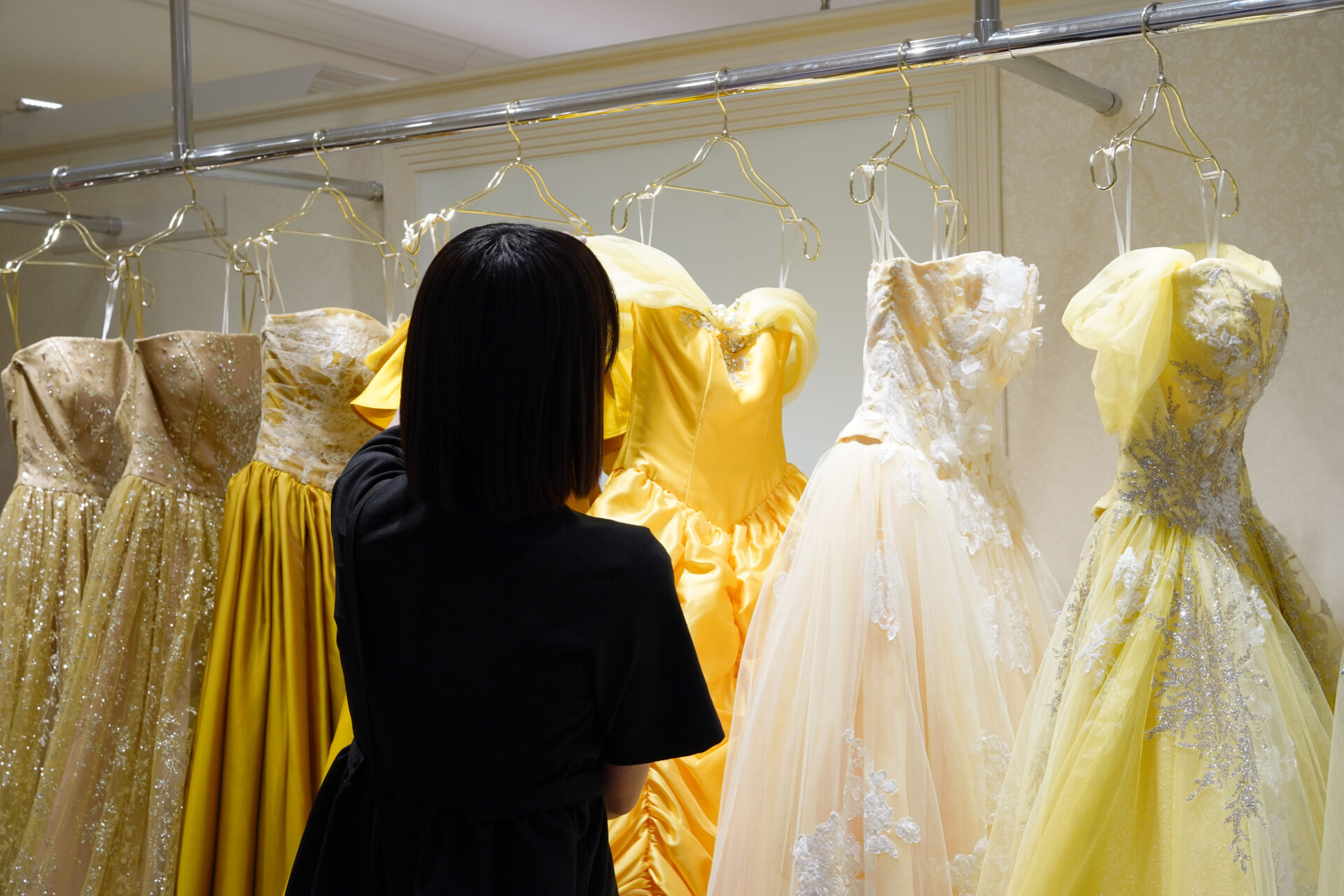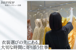 Topics&News トピックス&ニュース Photo Wedding Momona.Yokohama,Kawasaki,Kamakura HOME > トピックス&ニュース > 衣装選びの先にある、大切な時間に寄り添う仕事 2026.02.18 update 2026.01.31 Topics インタビュー 衣装選びの先にある、大切な時間に寄り添う仕事 撮影場所やシーンに合わせた衣装のご提案から、ご試着のサポートまで、ウェディングパートナーとして活躍する池田。 入社1年目の彼女は、お客様一人ひとりと丁寧に向き合いながら仕事に日々向き合っています。 今回は、日々の業務内容をはじめ、ブライダル業界を志したきっかけや仕事のやりがい、そしてこれから大切にしていきたい目標まで。新人として現場に立つ今だからこその、リアルな想いを聞きました。 目次ブライダルの世界に進むことを決めたきっかけドレス選びだけではない現場のリアル一人ひとりの「似合う」に向き合ってきた時間会社の魅力は「相談しやすい距離感」と「見ていてくれる安心感」書道を通して会社を盛り上げる「付加価値」にしたい ブライダルの世界に進むことを決めたきっかけ — ブライダル業界、そしてモリノブライズを選んだ理由を教えてください。 私は可愛いものを見るのが好きだったこともあり、いつか衣装に携わる仕事ができたらと思ったのが最初のきっかけでした。 ただ、高校生の頃はブライダル業界を目指していたわけではなく、進路としても現実味があったわけではありません。大学に進学してからも、興味の中心にあったのは洋服やファッションで、ファッション雑誌など出版の仕事に携われたらいいなと漠然と考えていたんです。 一方で、就職活動を進めていく中で、自分が好きなものを仕事としてちゃんと扱える環境ってどこだろうと改めて考えるようになりました。 そのときに見えてきたのが、ドレスや衣装の世界だったんです。洋服と同じように“好き”という気持ちが起点にありながら、もっと人生の節目に近いところで人に寄り添える仕事でもあるという部分に惹かれて、ブライダル業界への関心が強くなっていきました。 ブライダルの企業は数多くありますが、モリノブライズに惹かれた理由は大きくふたつあります。 ひとつは、ドレスだけでなく和装にも携われる環境があることです。もうひとつは、新郎新婦様だけで完結するのではなく、お母様やご家族を含めて家族全体に寄り添う接客ができることです。 衣装選びは新郎新婦様にとって大切な時間であると同時に、ご家族にとっても特別な時間です。その空気の中で誰かの緊張をほぐしたり、背中を押したり、安心して当日を迎えられるように支えられる関わり方ができるのは素敵だなと思いました。 だからこそ家族全体に関われる場所で働きたいと考え、モリノブライズへの入社を決めました。 ドレス選びだけではない現場のリアル — 入社前のイメージとのギャップはありましたか? 入社するまでは一緒にドレスを選んで、試着して終わりというイメージを持っていました。 でも実際に働いてみると明細の確認をしたり、ネットでドレスを探してご提案したり、他店舗から衣装を取り寄せたりと想像以上に業務の幅が広くて驚きました。 また、体力的な大変さも想像以上でしたね。 ドレスは見た目以上に重く、素材やトレーンの長さによって重さも大きく変わります。重いものだと、一着運ぶだけで精一杯なこともあります。 その中でも、いちばん難しいと感じているのは「お客様の言葉にできない好みを見つけること」です。 新郎新婦様が頭の中で思い描いているイメージを一緒にすり合わせながら形にしていく作業は、本当に難しいなと感じますし、やりがいを感じられる部分でもあります。 私たちは素材名や形の名前を把握しているので、「こういうドレスがある」と自然に思い浮かぶのですが、お客様は素材の名前が分からないことも多いです。 そのため、私が持ってきたドレスが「イメージと違う」となることもありますし、画像で見ていた印象と実物を見たり試着したりした後の印象が異なることも少なくありません。 お客様の「知らない」と私たちの「知っている」の間にあるギャップを、どのように埋めていくかが、この仕事のいちばん難しいところです。同時に、この仕事がどれだけお客様一人ひとりに時間をかけて寄り添う仕事なのかを実感する部分でもあります。 一人ひとりの「似合う」に向き合ってきた時間 — 印象的なお客様のエピソードがあれば教えてください。 とあるお客様を担当したときのことです。 お客様は、「この色味は自分には似合わない」と、最初から候補に入れていなかったドレスがありました。ただ、私にはそのドレスがどうしても似合うように感じられたんです。 そこで「絶対にお似合いだと思うので、一度だけ着てみませんか」とお声がけし、ご試着いただきました。実際に袖を通していただくと、そのままそのドレスに決まりました。 後日、「本当にありがとうございます」と言っていただけたと