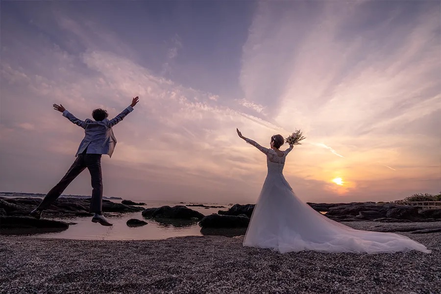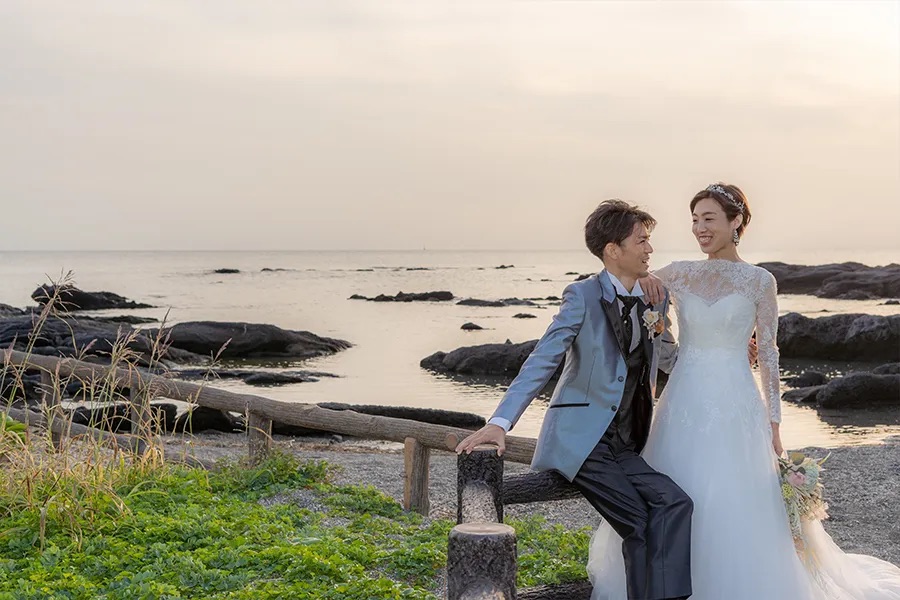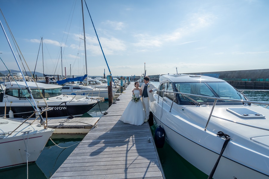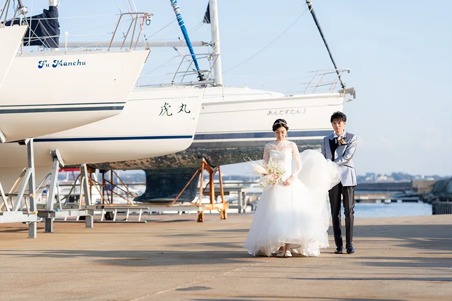 Topics&News トピックス&ニュース Photo Wedding Momona.Yokohama,Kawasaki,Kamakura HOME > トピックス&ニュース > 佐島マリーナで叶える、海と光に包まれるロケーションフォト 2026.03.20 update 2026.03.19 フォトウェディングの基礎知識 #結婚準備 #結婚が決まったら#フォトウェディングの費用#フォトウェディングの準備#ドレスで洋装フォトウェディング#ロケーションフォトウェディング 佐島マリーナで叶える、海と光に包まれるロケーションフォト 佐島マリーナ は、神奈川県横須賀市佐島の海沿いに広がるマリンリゾートエリアです。 海を背景にした美しい景色と開放感のある空間が特徴で、海辺ならではの光や色彩が写真を鮮やかに彩ります。まるでヨットハーバーのような洗練された雰囲気と、海と空が溶け合う水平線の情景は、フォトウェディングのロケーションとしても人気の高いスポットです。 佐島マリーナならではの自然光と潮風に包まれたロケーションは、ナチュラルな一枚を残したいカップルや、海辺らしい爽やかな写真を求める方にぴったり。 今回は、佐島マリーナでの撮影がどのような写真になるのか、そしてロケーションとしての魅力と、撮影を検討する際に知っておきたい注意点についてお伝えします。 目次海とリゾートの美しい風景が魅力時間帯で楽しむ、佐島マリーナの表現朝のやわらかな光日中の爽快な青夕暮れのやわらかな色合い季節ごとの風景と空気感春:やわらかな海風と透明感のある光夏:鮮やかな青空と光がきらめく海秋:穏やかな日差しと落ち着いた色合い冬:澄んだ空気と遠景まで広がる景色佐島マリーナでロケーションフォトを行う際の注意点佐島マリーナの撮影事例横浜・神奈川県のウェディングフォトならフォトウェディングモモナ 海とリゾートの美しい風景が魅力 佐島マリーナは、海を間近に感じながら撮影できる環境が大きな魅力です。 ハーバーに停泊するクルーザーやボートを背景に入れることで、海辺のリゾート感を写真に取り入れられます。また、砂浜や防波堤の広がるエリアでは、波音や海風を感じながら自然体の表情を残すことが可能です。 佐島マリーナでの撮影では、海・空・光の三要素が絶妙に絡み合い、青空と海のグラデーション、やわらかな夕焼け、そして水平線の遠景など、多彩なシーンを切り取ることができます。 季節や時間帯によって光が変わることで、同じ場所でも印象の異なる写真が残せる点が、佐島マリーナのロケーションフォトの魅力です。 時間帯で楽しむ、佐島マリーナの表現 佐島マリーナは時間帯によって光と色の印象が変わるため、それぞれの時間帯で写真の雰囲気が大きく異なります。 朝のやわらかな光 朝は海辺特有の清々しい空気に包まれ、水平線から差し込む光がやさしく全体を照らします。この時間帯では静けさの中で撮影が進み、自然体の表情が引き立ちやすい特徴があります。 日中の爽快な青 太陽が高く昇る日中は、海と空が鮮やかな青に映え、波打ち際の光がきらめくシーンが撮影できます。明るく伸びやかな写真を残したいカップルにも適した時間帯です。 夕暮れのやわらかな色合い 夕暮れ時は、オレンジから紫へと変わるグラデーションが海を包み込み、ドラマチックな写真を演出します。逆光を活かしたシルエットカットなど、感情を写し込む一枚が残せるのもこの時間帯の特徴です。 季節ごとの風景と空気感 佐島マリーナは、季節によって光の質や海の表情が変わり、その違いが写真の雰囲気にも自然に表れます。 ここでは、四季折々の魅力について見ていきましょう。 春:やわらかな海風と透明感のある光 春の佐島マリーナは、穏やかな海風とやわらかな光に包まれた、落ち着いた雰囲気が特徴です。強い日差しが少なく、自然光が均一に回り込むため、肌のトーンもやさしく写り、透明感のある写真に仕上がります。 新たなスタートを迎える季節らしい、軽やかで清潔感のある一枚を残したい方に適しています。 夏:鮮やかな青空と光がきらめく海 夏の佐島マリーナは、空と海の青さが際立つ季節です。太陽の光を反射してきらめく海面や、はっきりとしたコントラストの景色が、開放感のある写真を生み出します。 リゾート感を大切にしたい方や、明るく伸びやかな雰囲気のフォトウェディングを求める方に向いています。 秋:穏やかな日差しと落ち着いた色合い 秋は、日差しがやわらぎ、全体の色味が落ち着く季節です。強いコントラストが抑えられることで、衣装や表情が自然に引き立ち、しっとりとした雰囲気の写真を残すことができます。 大人っぽい印象や、静かな空気感を大切にした撮影に適した時期です。 冬:澄んだ空気と遠景まで広がる景色 冬の佐島マリーナは、空気が澄み、遠くの景色までくっきりと見渡せるのが特徴です。水平線がはっきりと浮かび上がり、シンプルで奥行きのある構図が生まれます。 人の気配も少なく、落ち着いた環境で撮影が進めやすいため、静けさや余白を大切にした一枚を