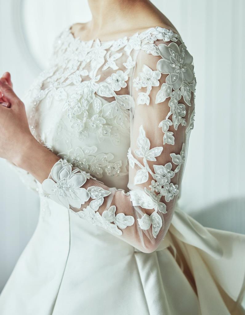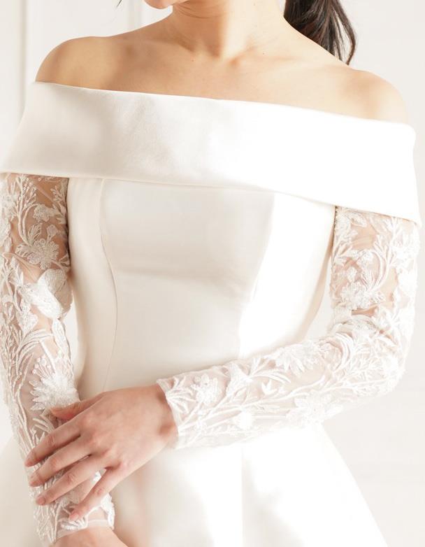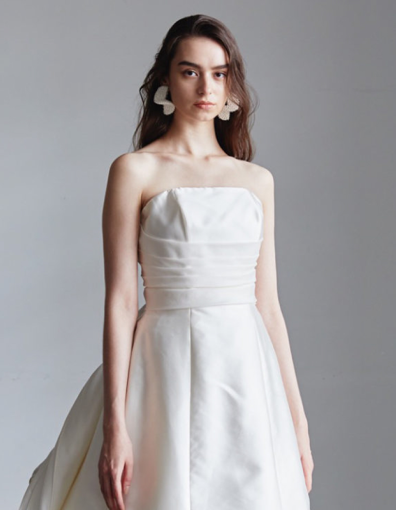 Topics&News トピックス&ニュース Photo Wedding Momona.Yokohama,Kawasaki,Kamakura HOME > トピックス&ニュース > 首元のデザインで、印象は変わる。ネックラインの種類とその美しさ 2025.12.22 婚礼衣装・ウェディングドレス・着物 #ウェディングドレス選び・レンタル#ドレスで洋装フォトウェディング 首元のデザインで、印象は変わる。ネックラインの種類とその美しさ ドレス選びは、花嫁さまの印象を左右する大切なプロセスです。 色やシルエット、袖の有無など選ぶポイントはさまざまありますが、その中でも意外と見落とされがちなのが「ネックライン(襟元)」です。 実はこのネックラインこそ、顔まわりの印象や首・肩の見え方を大きく変える、ドレス選びの“要”ともいえる要素です。 同じドレスでも、ネックラインが変わるだけで雰囲気は驚くほど違って見えます。可憐で柔らかな印象にも、大人っぽく洗練された印象にも、さらにはクラシカルやモードな雰囲気にも。 ほんの少しのラインの違いが、花嫁さまの美しさを引き出します。 今回は代表的なネックラインの種類と特徴、顔立ち・体型に合わせた選び方、そしてフォトウェディングでのシーンとの相性までを、Momonaがわかりやすく解説します。 これからドレス選びを始める花嫁さまが、自分らしさを最も美しく引き立てる一着と出会えるよう、ぜひ参考にしてみてください。 目次花嫁さまの魅力を引き立てるネックラインネックラインの種類と、それぞれが描く美しさ清楚で洗練されたストレートライン可憐さを引き出す、スイートハートライン大人のエレガンスを演出するVネック上品でクラシカルな、ボートネック丸みを帯びた優しい曲線のラウンドネック肩のラインを美しく魅せる、オフショルダー品格が感じられるクラシカルなハイネック可憐で上品なイリュージョンネックアシンメトリーが描く、優雅に映えるワンショルダーなりたい自分に導く、印象別ネックラインの選び方顔立ち・体型・骨格から選ぶ似合わせ術シーン・撮影スタイルで選ぶネックライン横浜・神奈川県のウェディングフォトならフォトウェディングモモナ 花嫁さまの魅力を引き立てるネックライン ネックラインとは、ドレスの襟元を形作るデザインのことを指します。 フェイスラインや首の長さ、肩幅の見え方に直結するため、花嫁さま本来の魅力を最も引き立てる“要”となるパーツです。 大人っぽい雰囲気を演出したいときも、上品でクラシカルな印象を求めるときも、小顔効果を叶えたいときも、肩やデコルテをより美しく見せたいときも、そのイメージを決定づけるのはネックラインの選び方次第です。 写真に映る印象を大きく左右するものなので、襟元のデザインにこだわることが、運命の一着に出会うための大切な第一歩になるのです。 ネックラインの種類と、それぞれが描く美しさ ネックラインには多くの種類がありますが、ここではウェディングドレスで人気のデザインを中心に紹介します。 Momonaが展開するドレス一覧はコチラからご覧ください 清楚で洗練されたストレートライン 胸元のラインをまっすぐ水平に切り取った、もっともベーシックで洗練されたネックラインです。清楚で上品な印象を与え、体型や顔立ちを問わず幅広い花嫁さまに似合いやすいのが特徴です。 シンプルなデザインだからこそ、アクセサリーやヘアスタイル次第で雰囲気を柔らかくも、きりっと大人っぽくも調整できます。初めてドレス選びをする花嫁さまにも選ばれやすい万能ネックラインといえるでしょう。 可憐さを引き出す、スイートハートライン ハートのラインを描くように胸元をカットしたデザインで、女性らしさを引き立てる代表的なネックラインです。 フェミニンで可憐な雰囲気が生まれるだけでなく、デコルテを美しく見せ、胸元の立体感をほどよく強調してくれます。ロマンティックな印象に仕上げたい花嫁さまにぴったりのデザインです。 大人のエレガンスを演出するVネック 首元がV字に深く開いたネックラインで、視線が自然と縦のラインに流れるデザインです。 首を長く、フェイスラインをすっきり見せてくれるため、大人っぽく洗練された雰囲気を演出できます。開き具合によって印象が変わり、浅めなら上品に、深めならシャープでモードな印象に仕上がるのが特徴です。 上品でクラシカルな、ボートネック ボートネックは、鎖骨のラインに自然に沿うように緩やかなカーブを描くネックラインです。 肌の露出を抑えつつも、デコルテを美しく見せてくれるため、上品でクラシカルな雰囲気を求める花嫁さまにぴったりのデザインです。控えめな印象の中に、柔らかな女性らしさが漂います。 丸みを帯びた優しい曲線のラウンドネック ラウンドネックは、丸みを帯びた優しい曲線が特徴のネックラインです。 柔らかく女性らしい雰囲気を引き立ててくれるため、スタジオ撮影からロケーションフォトまでどんなシーンとも相性が良いのが魅力。 顔まわりをふ