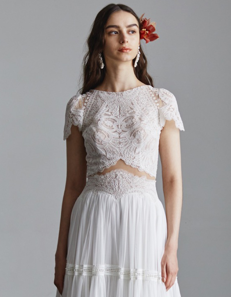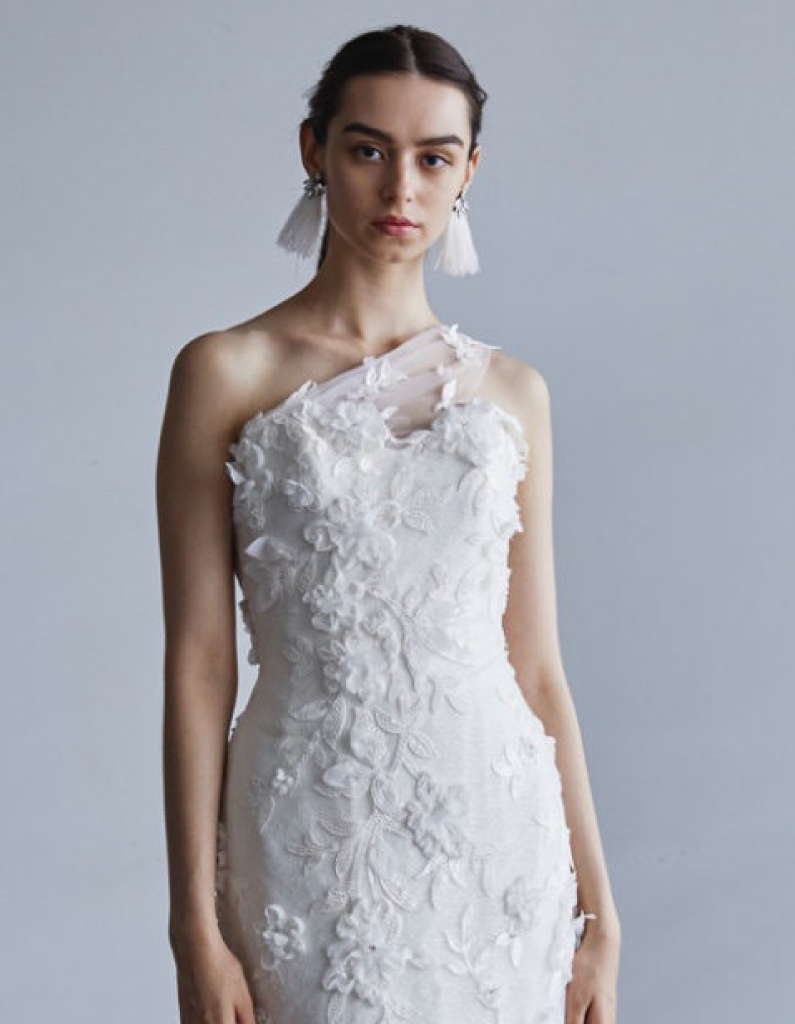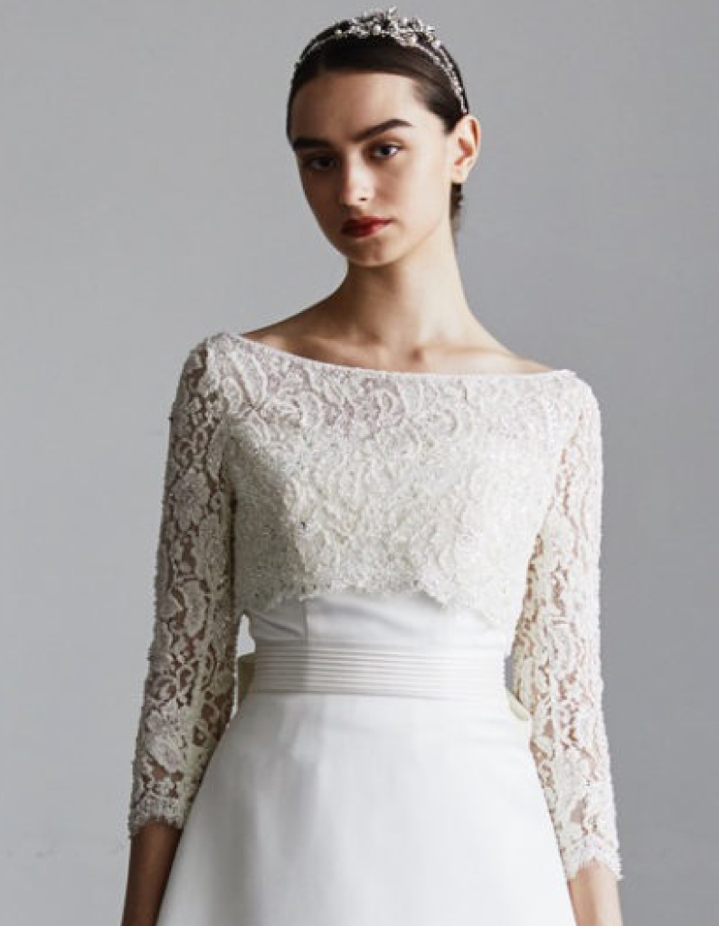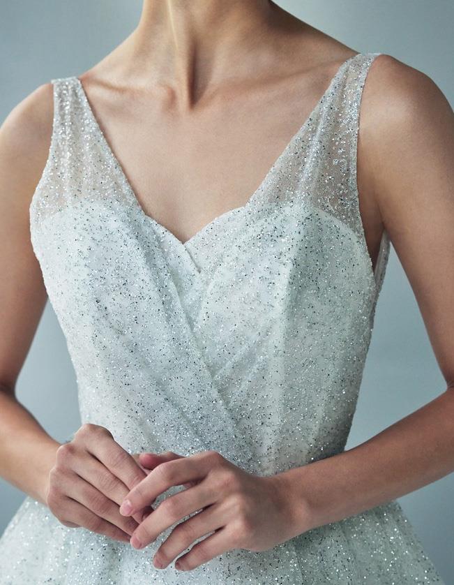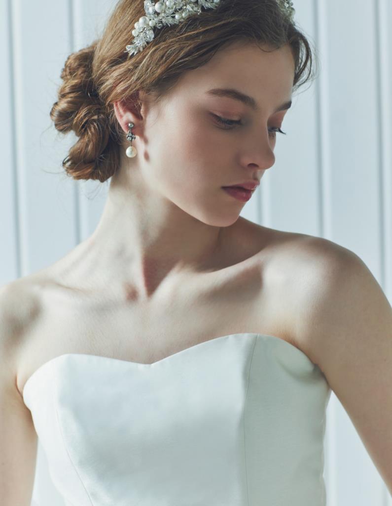 ハートのラインを描くように胸元をカットしたデザインで、女性らしさを引き立てる代表的なネックラインです。 フェミニンで可憐な雰囲気が生まれるだけでなく、デコルテを美しく見せ、胸元の立体感をほどよく強調してくれます。ロマンティックな印象に仕上げたい花嫁さまにぴったりのデザインです。