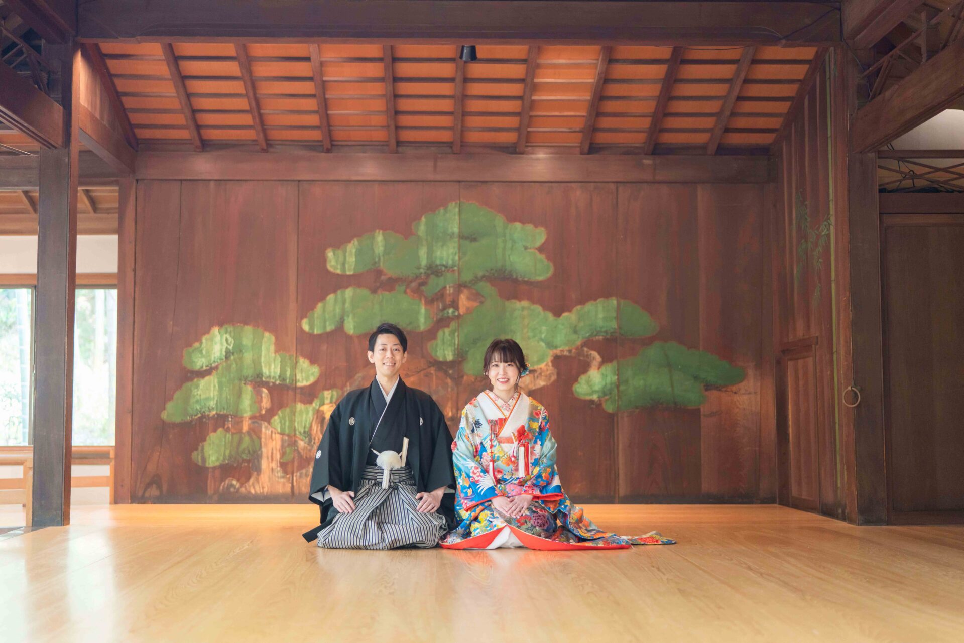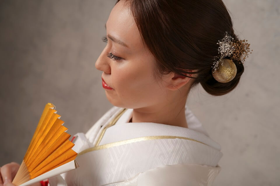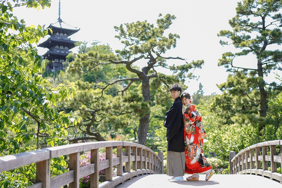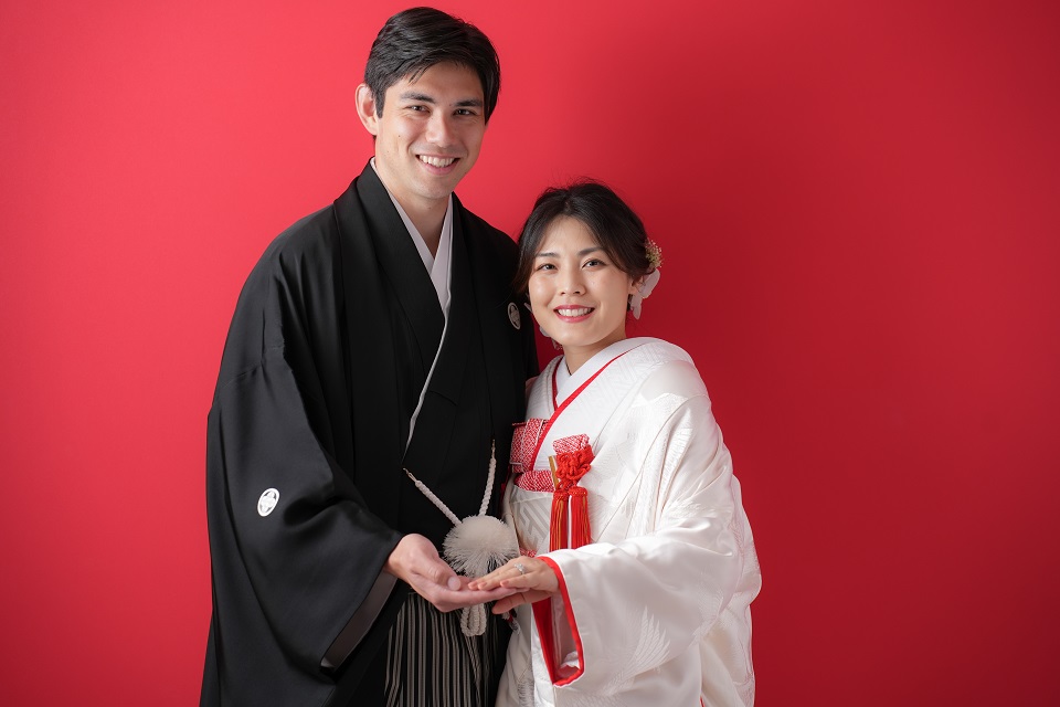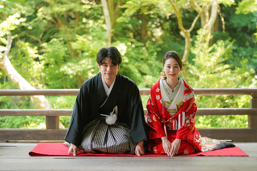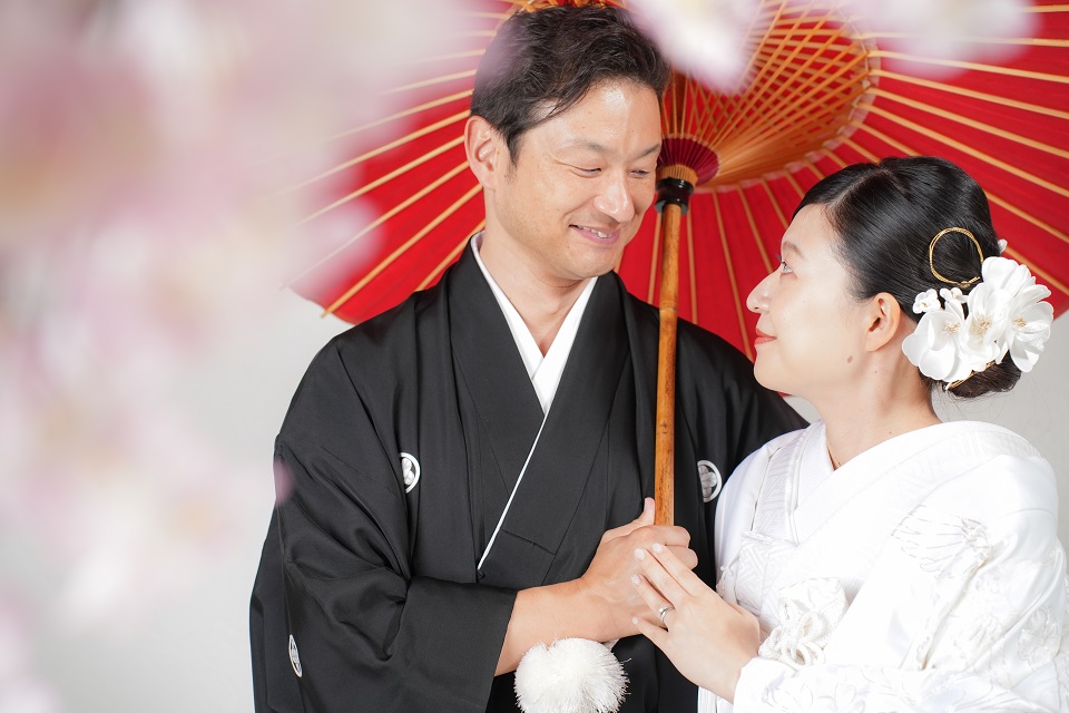 Topics&News トピックス&ニュース Photo Wedding Momona.Yokohama,Kawasaki,Kamakura HOME > トピックス&ニュース > 和装フォトウェディングのポーズと写真の残し方 2026.02.18 update 2026.01.31 フォトウェディングの基礎知識 #フォトウェディングの準備#着物で和装フォトウェディング#スタジオフォトウェディング#ロケーションフォトウェディング 和装フォトウェディングのポーズと写真の残し方 フォトウェディングを検討する方が増えるなか、実際に写真を残す場面になると「どんなポーズで撮ればいいのか」が気になるポイントとして挙がりやすくなります。 とくに和装の場合、洋装と比べて所作や立ち姿に慣れていない方がほとんどです。ドレスのように自由に動くイメージが持ちにくく、どう立てばいいのか不安と感じてしまうことも少なくありません。 さらに写真撮影という非日常の状況に緊張し、「きれいに写らなければ」「失敗したくない」と意識しすぎてしまうことで表情や動きが固くなってしまうケースも見られます。 そこで今回は、フォトウェディングの中でも和装撮影に焦点をあて、よく選ばれているポーズや考え方を整理しながら初めての方でも安心して撮影を迎えられるポイントをご紹介していきます。 目次和装フォトウェディングでよく選ばれる定番ポーズ正座のポーズ並んで立つポーズ見つめ合うポーズ後ろ姿のポーズ雰囲気別に考える和装フォトウェディングのポーズ自然でナチュラルな雰囲気かわいらしい印象大人っぽく落ち着いた雰囲気かっこいい雰囲気小物を使った和装ポーズのアイデア撮影場所によって変わるポーズの考え方ポーズで失敗しないために大切なこと横浜・神奈川県のウェディングフォトならフォトウェディングモモナ 和装フォトウェディングでよく選ばれる定番ポーズ 和装フォトウェディングでは、初めての方でも無理なく取り入れやすい「定番のポーズ」がいくつかありますどれも自然な姿勢で撮影でき、和装ならではの落ち着きや美しさを引き立ててくれるのが特徴です。 ここでは和装フォトウェディングの定番ポーズを紹介します。 正座のポーズ 正座のポーズは和装ならではの品のある雰囲気を残せる、もっとも定番のポーズです。背筋を伸ばして座るだけで自然と姿勢が整い、落ち着いた印象の写真に仕上がります。 視線をカメラに向けるか、少し外すかによっても印象は変わります。おふたりで向き合えばやわらかく温かい雰囲気に、正面を向けば格式のある一枚に仕上がります。 動きが少ないポーズのため「どう動けばいいかわからない」と不安な方でも取り入れやすく、和装撮影の最初に選ばれることも多いポーズです。 並んで立つポーズ 新郎新婦が横に並んで立つポーズは、和装フォトウェディングの中でもとても取り入れやすい定番のひとつです。特別な動きをする必要がなく、自然体のまま撮影できるため緊張しやすい方にも向いています。 背筋を軽く伸ばし肩の力を抜いて立つだけで、和装ならではの縦のラインがきれいに映えます。衣装の柄や帯の位置も見えやすく、全身のバランスが整った写真になりやすいのが特徴です。 視線をカメラに向ければきちんとした印象に、少し目線を外せば柔らかく落ち着いた雰囲気になります。表情や視線の向きを少し変えるだけでも、印象の異なる写真を残すことができます。 「どんなポーズをすればいいかわからない」という方でも取り入れやすく、和装撮影の基本としてよく選ばれるポーズです。 見つめ合うポーズ 新郎新婦がお互いに視線を向けるポーズは、自然な表情を引き出しやすい定番のポーズです。カメラを意識しすぎなくてよいため、撮影に慣れていない方でも緊張が和らぎやすくなります。 目を合わせることで思わず笑顔になったり、少し照れた表情がこぼれたりすることもあります。そうした何気ない表情こそ、あとから見返したときに「そのときの空気感」を思い出せる大切な一枚になります。 無理に表情を作る必要はありません。視線を向けて立つだけで和装ならではの落ち着いた雰囲気の中に、おふたりらしい温かさが自然と写し出されます。 かしこまりすぎず、やわらかな雰囲気の写真を残したい方に特に選ばれることの多いポーズです。 後ろ姿のポーズ 新郎新婦の後ろ姿を写すポーズは、和装ならではの美しさを引き立てられる人気のカットです。帯の結びや着物の柄、全体のシルエットがきれいに映り和装らしい上品な雰囲気を残すことができます。 顔の表情を意識しなくてよいため、撮影に緊張してしまう方でも取り入れやすいのが特徴です。カメラを気にせず立つだけで自然な一枚になるため、「写真が苦手」という方にも安心感があります。 少し距離を取って立ったり並んで同じ方向を向いたりするだけでも、落ち着いた空気感のある写真に仕上がります。静かで余韻のあるカットを残したい方におすすめのポーズです。 雰囲気別に考える和装フォトウェディングのポーズ 和装フォトウ