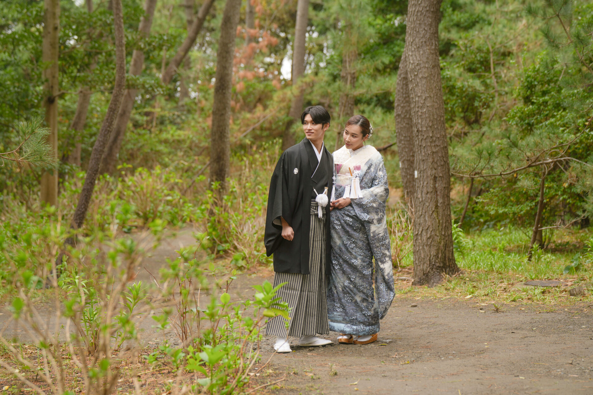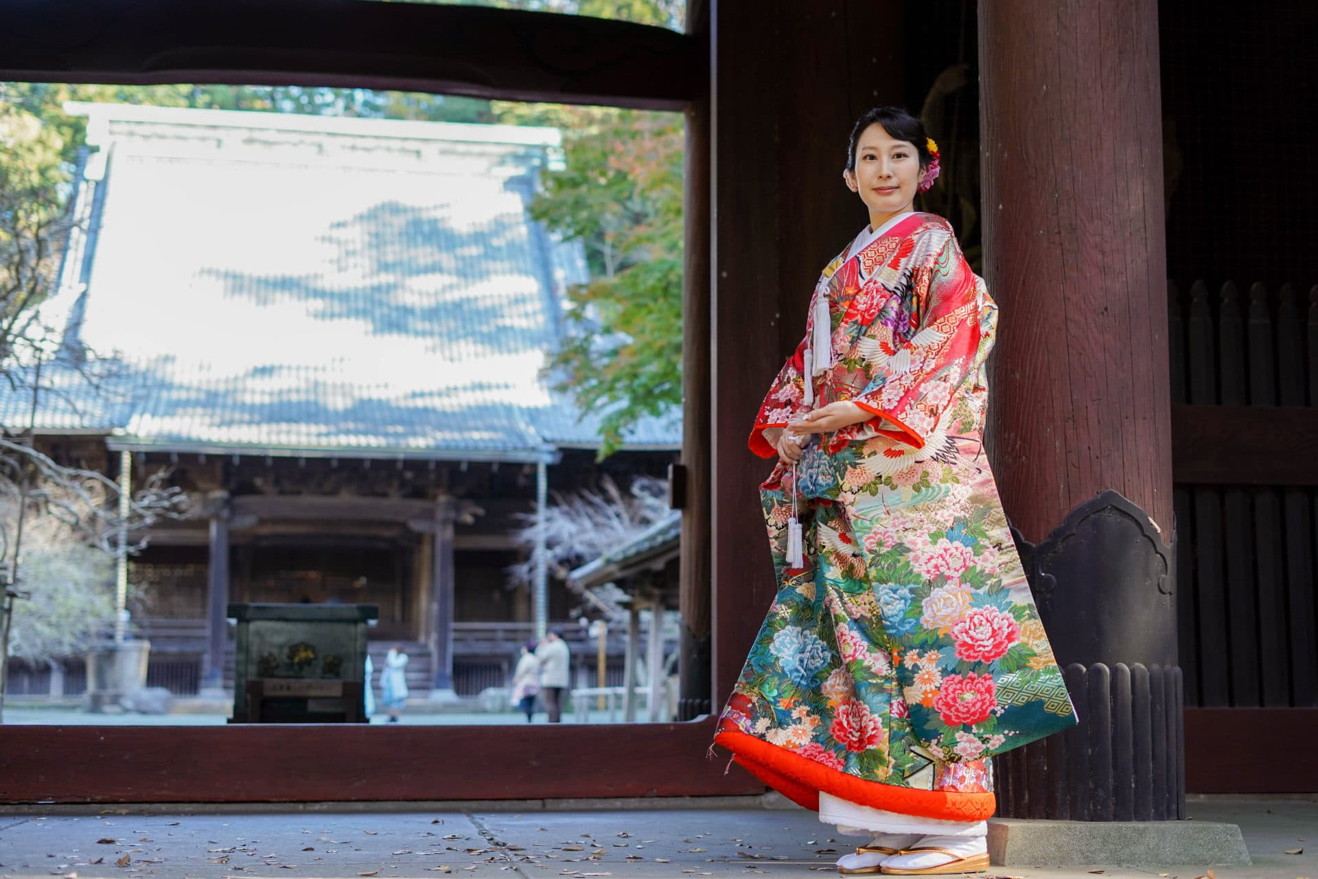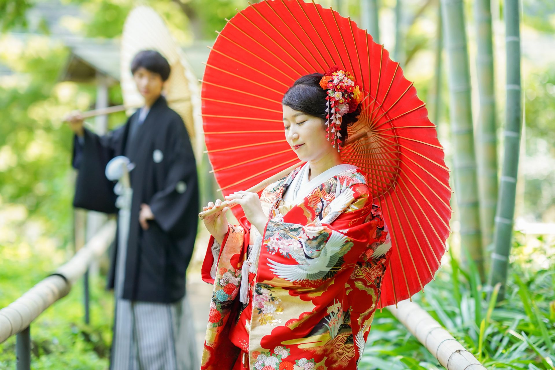 Topics&News トピックス&ニュース Photo Wedding Momona.Yokohama,Kawasaki,Kamakura HOME > トピックス&ニュース > 和装フォトウェディングのポーズと写真の残し方 2026.02.18 update 2026.01.31 フォトウェディングの基礎知識 #フォトウェディングの準備#着物で和装フォトウェディング#スタジオフォトウェディング#ロケーションフォトウェディング 和装フォトウェディングのポーズと写真の残し方 フォトウェディングを検討する方が増えるなか、実際に写真を残す場面になると「どんなポーズで撮ればいいのか」が気になるポイントとして挙がりやすくなります。 とくに和装の場合、洋装と比べて所作や立ち姿に慣れていない方がほとんどです。ドレスのように自由に動くイメージが持ちにくく、どう立てばいいのか不安と感じてしまうことも少なくありません。 さらに写真撮影という非日常の状況に緊張し、「きれいに写らなければ」「失敗したくない」と意識しすぎてしまうことで表情や動きが固くなってしまうケースも見られます。 そこで今回は、フォトウェディングの中でも和装撮影に焦点をあて、よく選ばれているポーズや考え方を整理しながら初めての方でも安心して撮影を迎えられるポイントをご紹介していきます。 目次和装フォトウェディングでよく選ばれる定番ポーズ正座のポーズ並んで立つポーズ見つめ合うポーズ後ろ姿のポーズ雰囲気別に考える和装フォトウェディングのポーズ自然でナチュラルな雰囲気かわいらしい印象大人っぽく落ち着いた雰囲気かっこいい雰囲気小物を使った和装ポーズのアイデア撮影場所によって変わるポーズの考え方ポーズで失敗しないために大切なこと横浜・神奈川県のウェディングフォトならフォトウェディングモモナ 和装フォトウェディングでよく選ばれる定番ポーズ 和装フォトウェディングでは、初めての方でも無理なく取り入れやすい「定番のポーズ」がいくつかありますどれも自然な姿勢で撮影でき、和装ならではの落ち着きや美しさを引き立ててくれるのが特徴です。 ここでは和装フォトウェディングの定番ポーズを紹介します。 正座のポーズ 正座のポーズは和装ならではの品のある雰囲気を残せる、もっとも定番のポーズです。背筋を伸ばして座るだけで自然と姿勢が整い、落ち着いた印象の写真に仕上がります。 視線をカメラに向けるか、少し外すかによっても印象は変わります。おふたりで向き合えばやわらかく温かい雰囲気に、正面を向けば格式のある一枚に仕上がります。 動きが少ないポーズのため「どう動けばいいかわからない」と不安な方でも取り入れやすく、和装撮影の最初に選ばれることも多いポーズです。 並んで立つポーズ 新郎新婦が横に並んで立つポーズは、和装フォトウェディングの中でもとても取り入れやすい定番のひとつです。特別な動きをする必要がなく、自然体のまま撮影できるため緊張しやすい方にも向いています。 背筋を軽く伸ばし肩の力を抜いて立つだけで、和装ならではの縦のラインがきれいに映えます。衣装の柄や帯の位置も見えやすく、全身のバランスが整った写真になりやすいのが特徴です。 視線をカメラに向ければきちんとした印象に、少し目線を外せば柔らかく落ち着いた雰囲気になります。表情や視線の向きを少し変えるだけでも、印象の異なる写真を残すことができます。 「どんなポーズをすればいいかわからない」という方でも取り入れやすく、和装撮影の基本としてよく選ばれるポーズです。 見つめ合うポーズ 新郎新婦がお互いに視線を向けるポーズは、自然な表情を引き出しやすい定番のポーズです。カメラを意識しすぎなくてよいため、撮影に慣れていない方でも緊張が和らぎやすくなります。 目を合わせることで思わず笑顔になったり、少し照れた表情がこぼれたりすることもあります。そうした何気ない表情こそ、あとから見返したときに「そのときの空気感」を思い出せる大切な一枚になります。 無理に表情を作る必要はありません。視線を向けて立つだけで和装ならではの落ち着いた雰囲気の中に、おふたりらしい温かさが自然と写し出されます。 かしこまりすぎず、やわらかな雰囲気の写真を残したい方に特に選ばれることの多いポーズです。 後ろ姿のポーズ 新郎新婦の後ろ姿を写すポーズは、和装ならではの美しさを引き立てられる人気のカットです。帯の結びや着物の柄、全体のシルエットがきれいに映り和装らしい上品な雰囲気を残すことができます。 顔の表情を意識しなくてよいため、撮影に緊張してしまう方でも取り入れやすいのが特徴です。カメラを気にせず立つだけで自然な一枚になるため、「写真が苦手」という方にも安心感があります。 少し距離を取って立ったり並んで同じ方向を向いたりするだけでも、落ち着いた空気感のある写真に仕上がります。静かで余韻のあるカットを残したい方におすすめのポーズです。 雰囲気別に考える和装フォトウェディングのポーズ 和装フォトウ